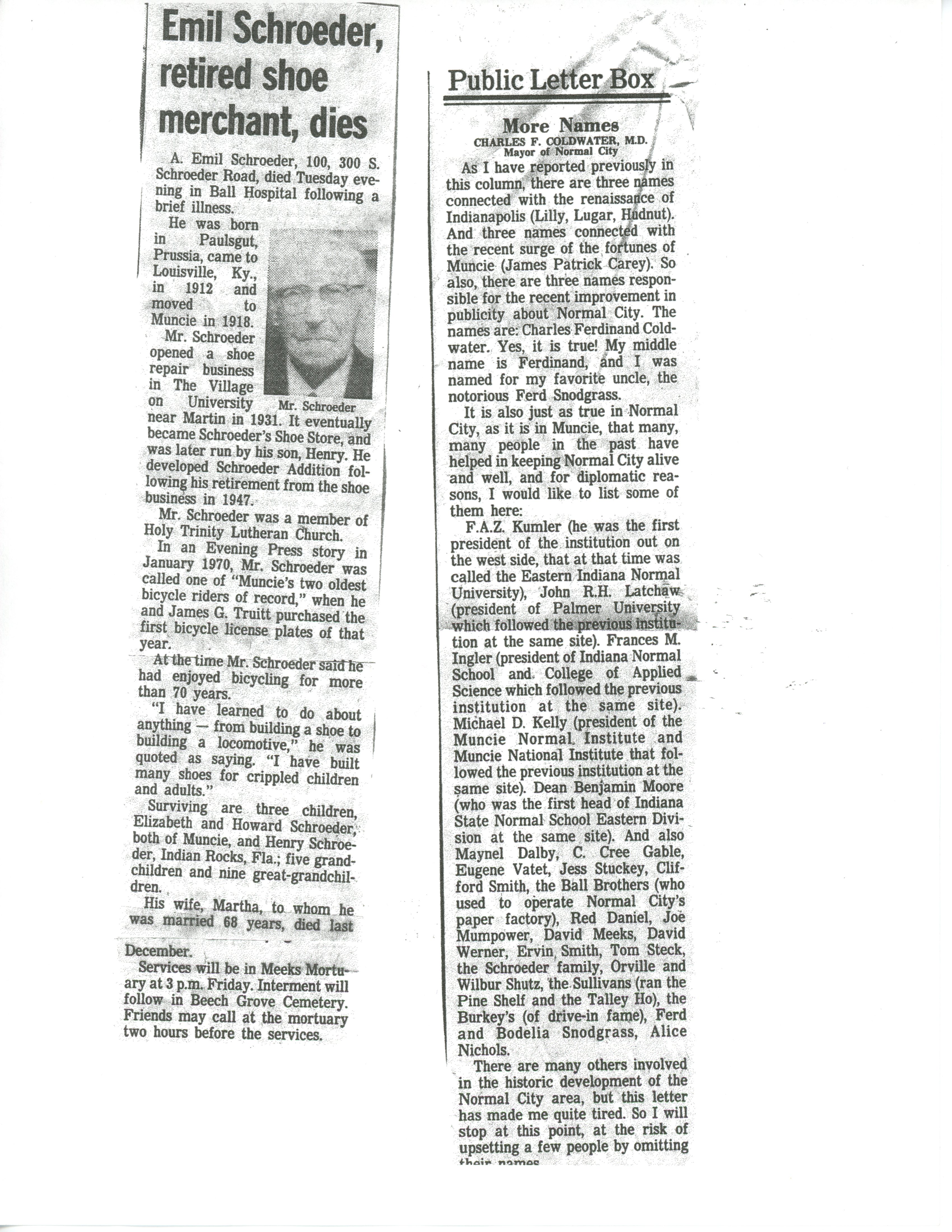 “Emil Schroeder, retired shoe merchant, dies” obit and letter from Charles F. Coldwater, M.D. on who was responsible for keeping Normal City “alive and well”