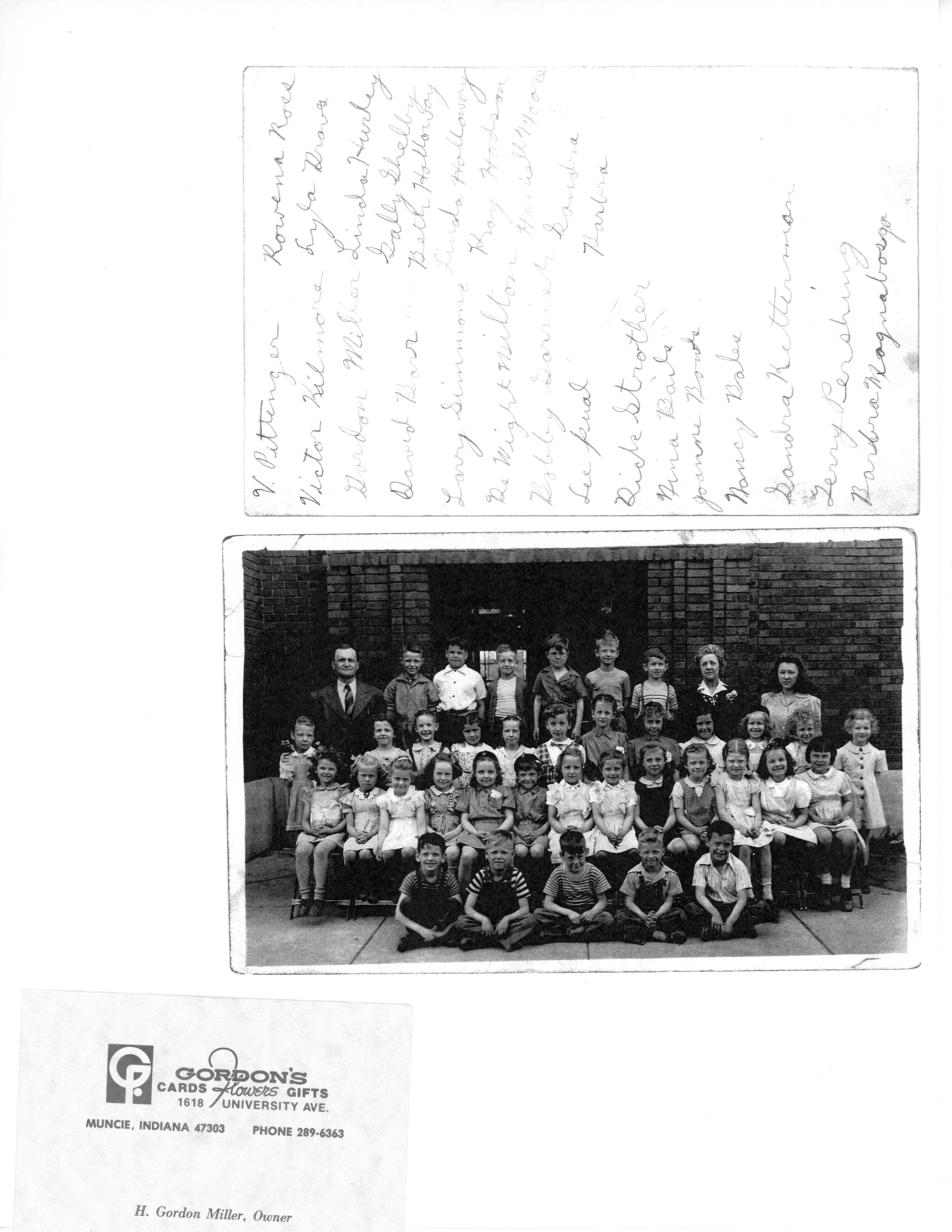 Emerson class photo featuring Gordon Miller and the tag he would attach to flower arrangements from the shop in the Village. Photo provided by Gordon and Malvia Miller.